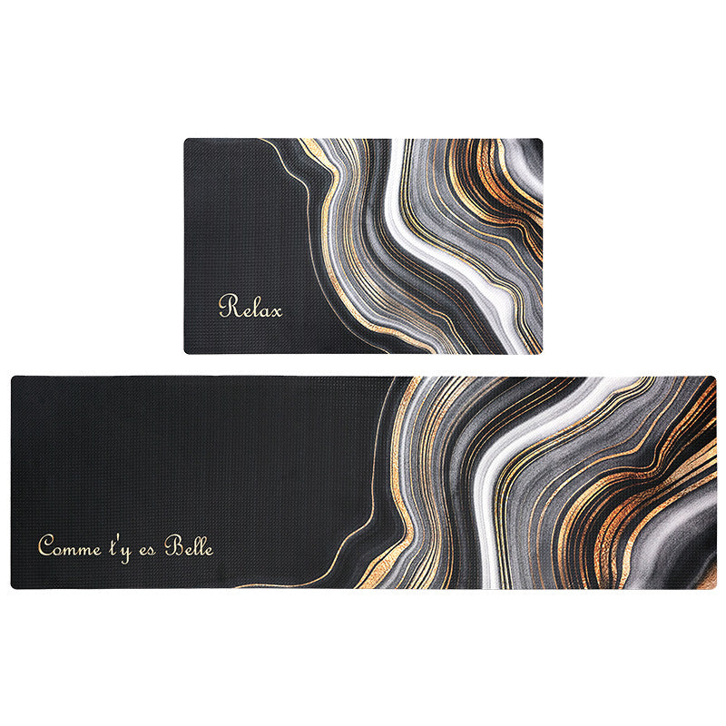 Feblilac Black Grey and Golden Wave Flow Line Pattern PVC Leather Kitchen Mat