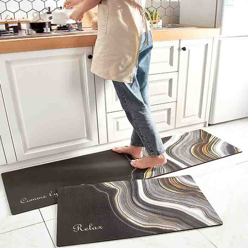 The Feblilac Black Grey and Golden Wave Flow Line Pattern PVC Leather Kitchen Mat is easy to use, and it's also a wonderful décor to your home.