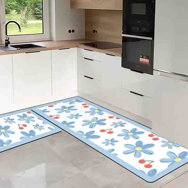 Feblilac Cherries in Blue Flowers PVC Leather Kitchen Mat