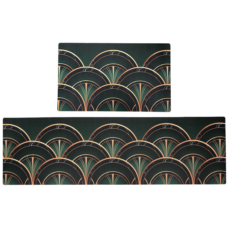 Feblilac Darker Green and Golden Fanshaped Pattern PVC Leather Kitchen Mat
