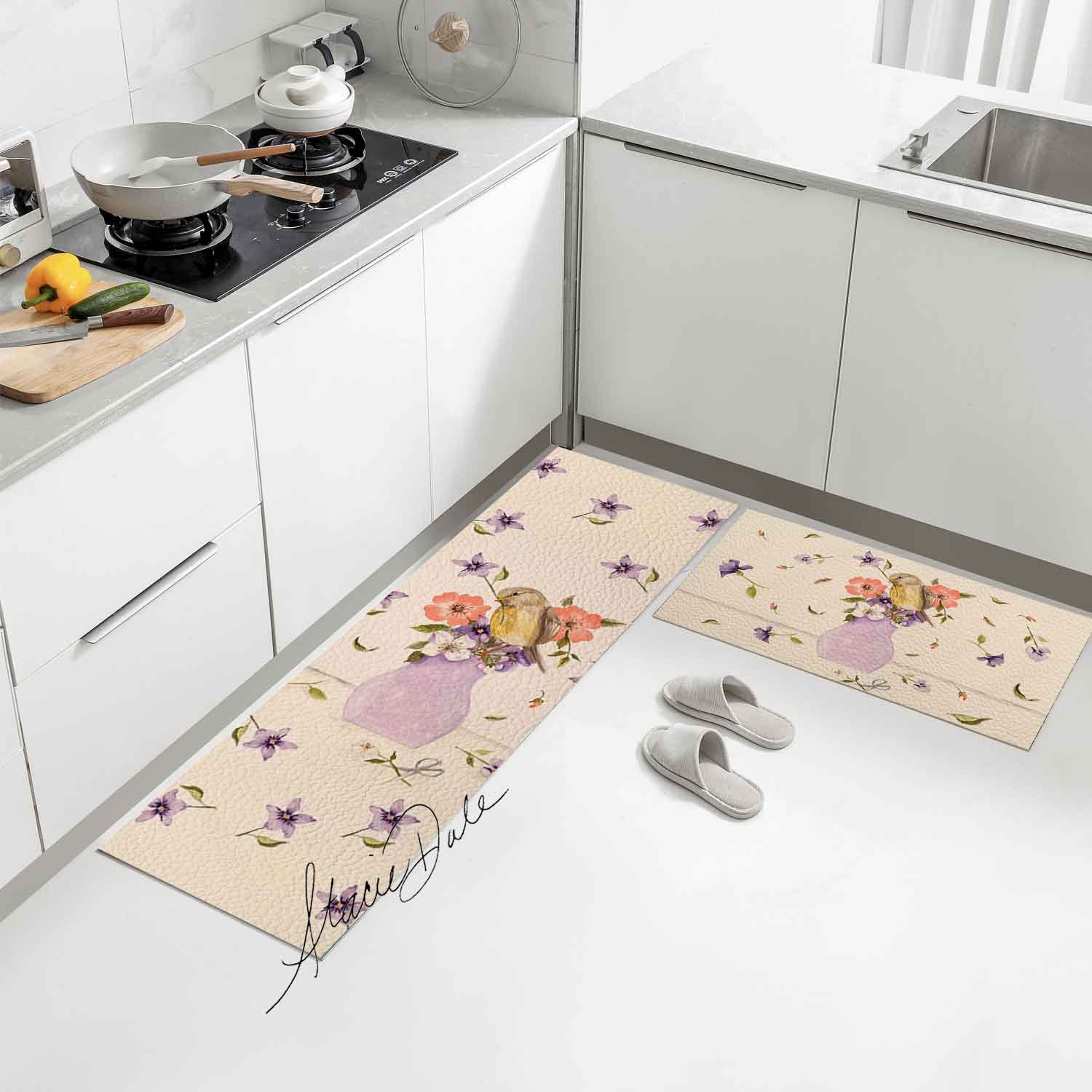 Feblilac Purple Vase Flower and Bird PVC Leather Kitchen Mat by Stacie from US