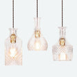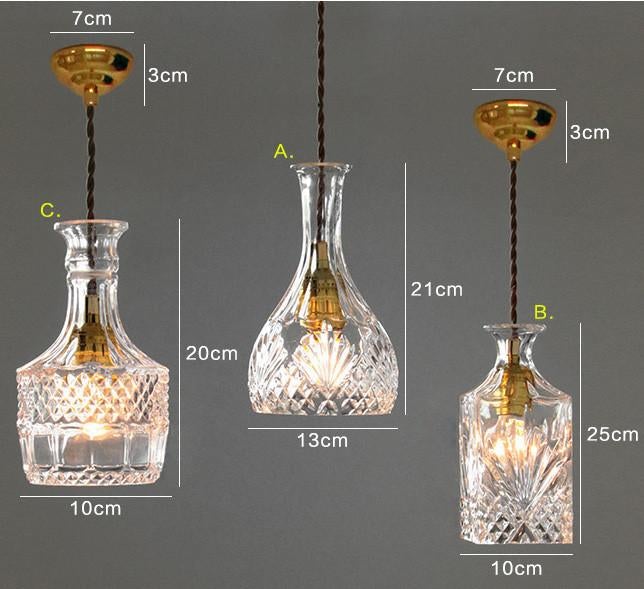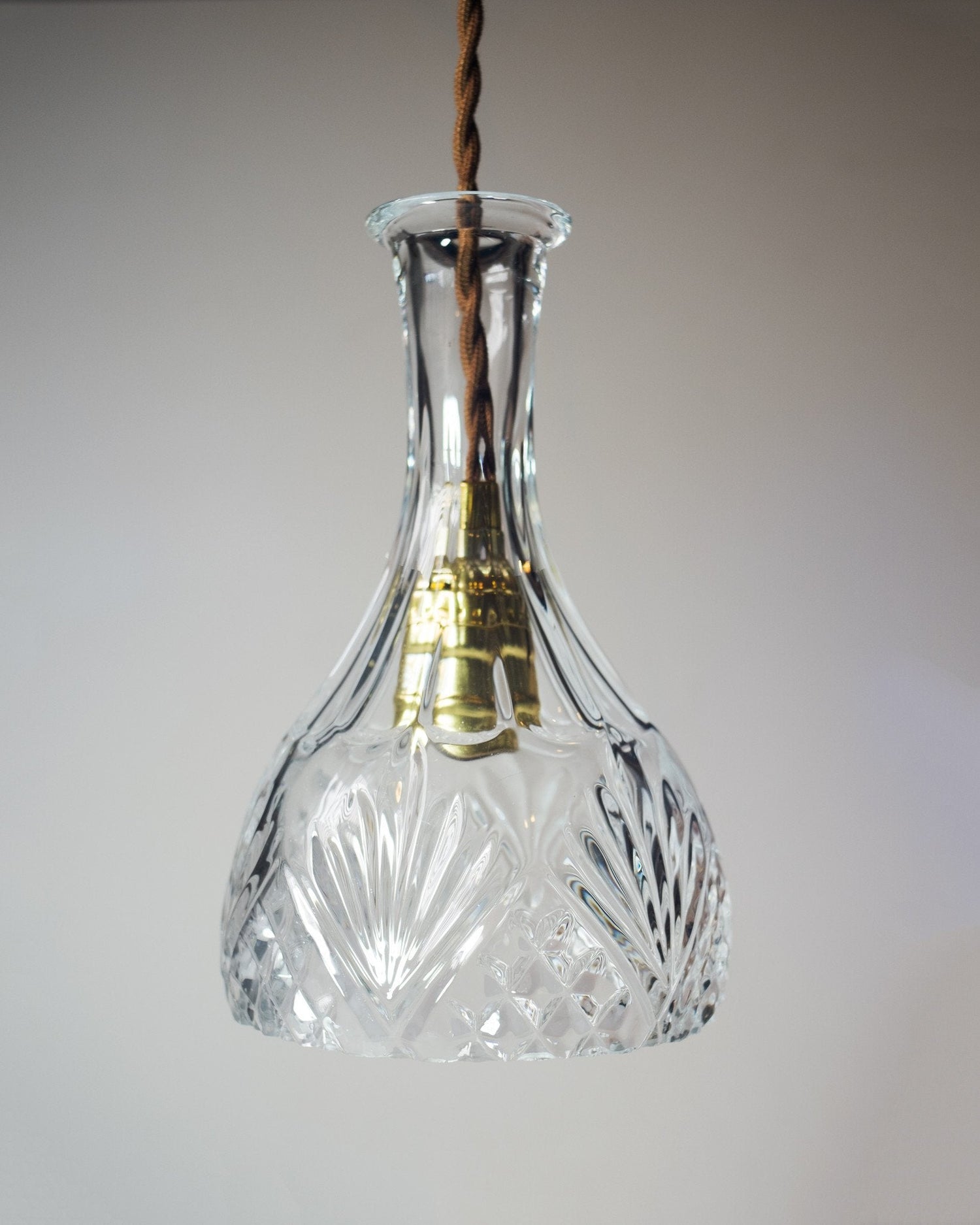 The bottle light Chandelier is a stunning lighting centrepiece featuring one Square, one Bell and one Tulip Decanter lights hung at various lengths to create a luxurious installation of clear, hand cut, crystal shades. Can be arranged as cluster pendant light chandelier
