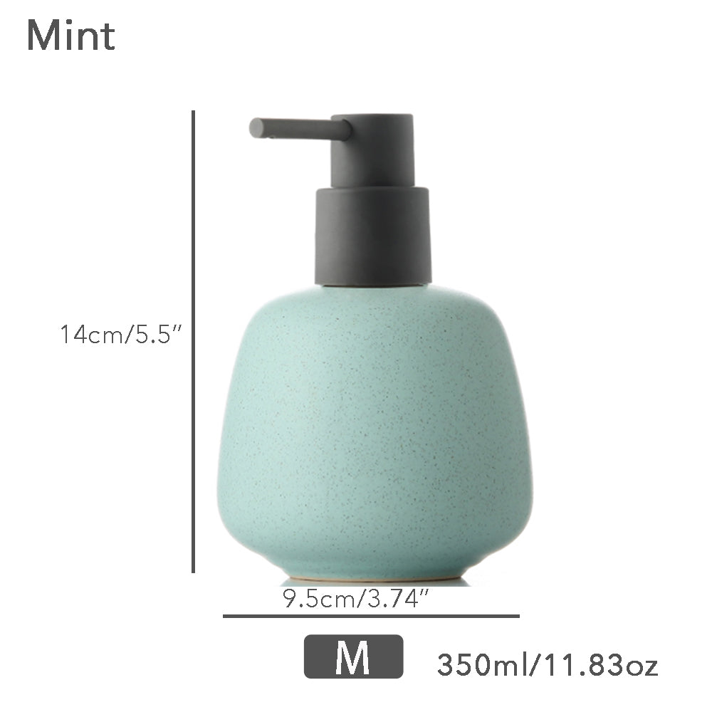 This soap dispenser is made of ceramic with a capacity of 350ml/11.83oz. It stands at 14cm/5.5'' tall and has a width of 9.5cm/3.74''.