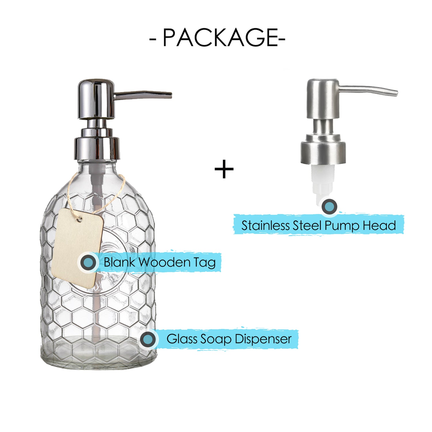 Package: Glass soap dispenser *1, Stainless steel pump head *1, blank wooden tag*1.