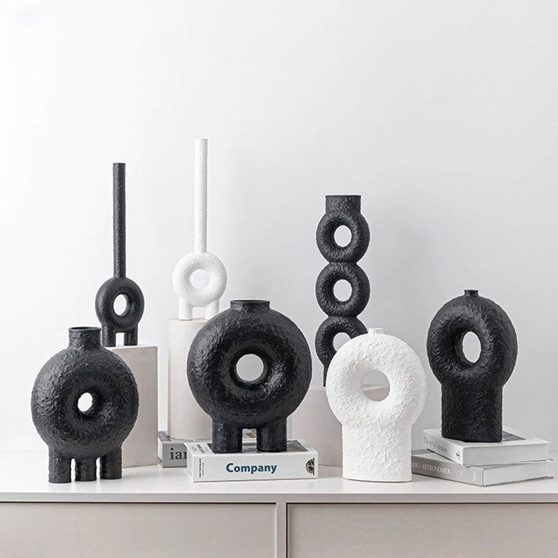 Enjoy the look of these modern vases in any space. Each one embraces the artistic look of the circle giving any space a bold modern look. Group them together to create your own dramatic look.
