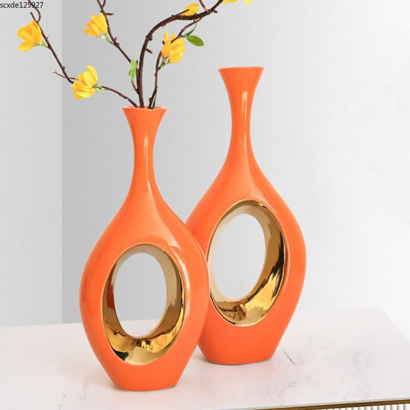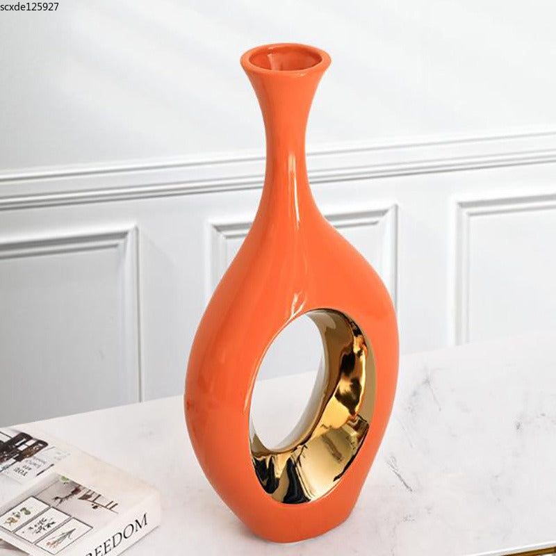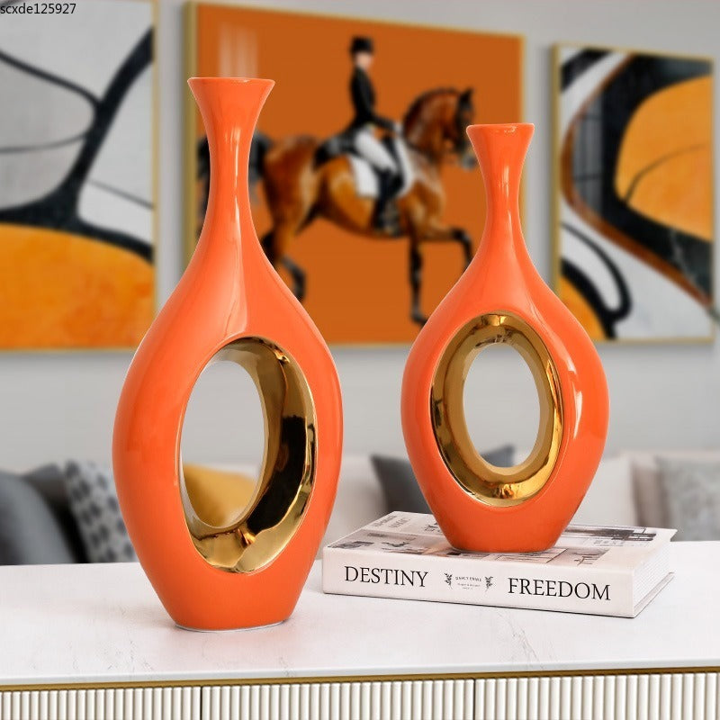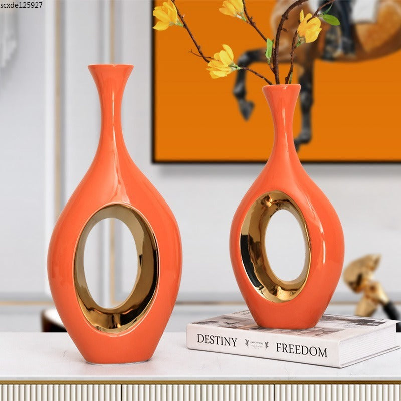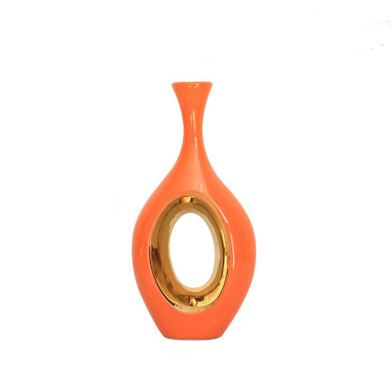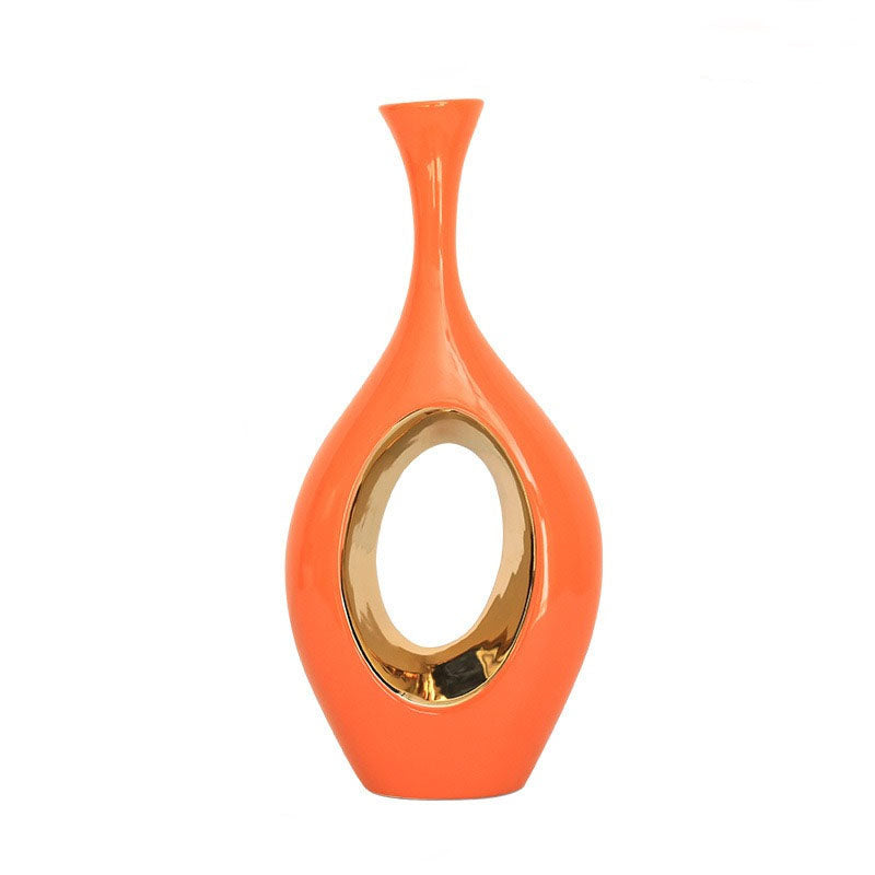 The vibrant color of orange captured in the beauty of a ceramic vase. The vases come in three sizes and highlighted with the beauty of gold. Group them together for a dramatic look.