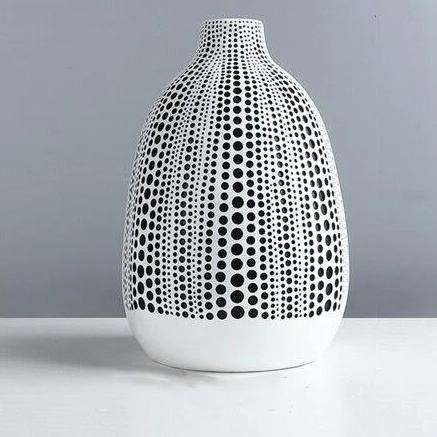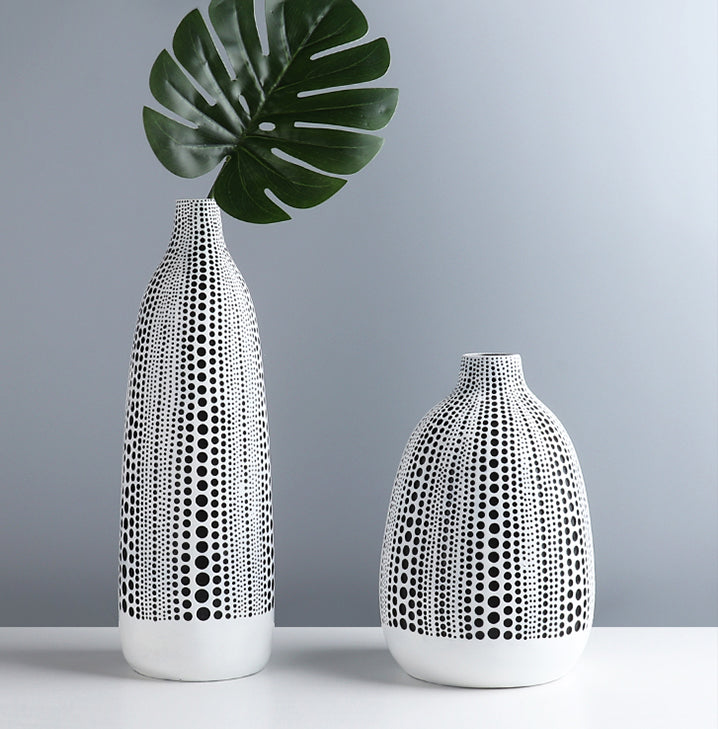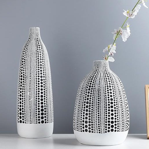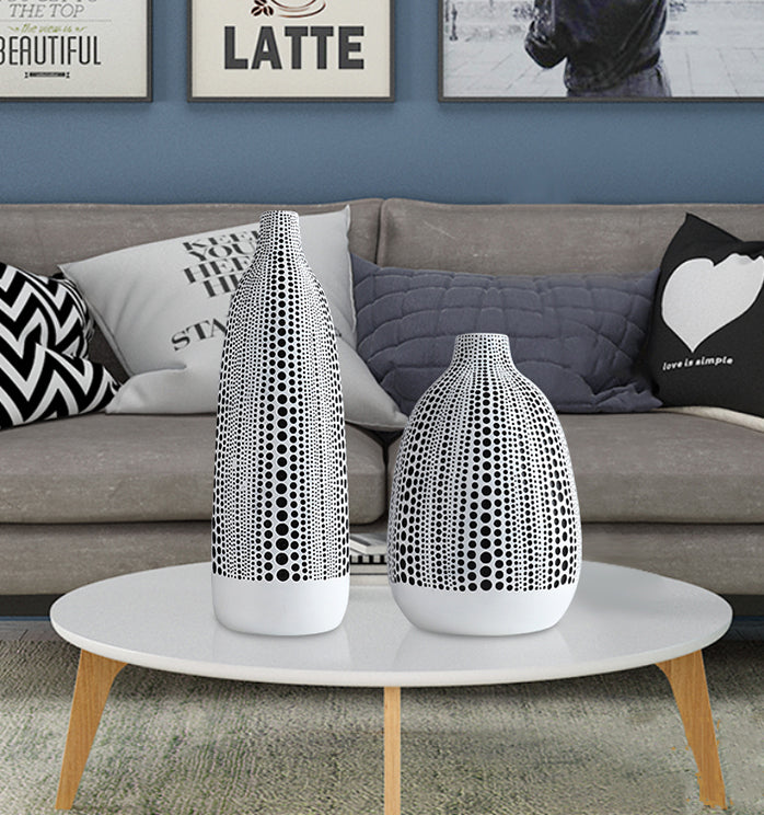 Let this abstract dot print of the ceramic vases mesmerize you. The vibrant dotted pattern makes a bold modern statement in any space. Add the Dots on Abstract Canvas Print to create a dramatic coordinated look. Embrace the boldness of black and white highlighted by this abstract pattern of dots.