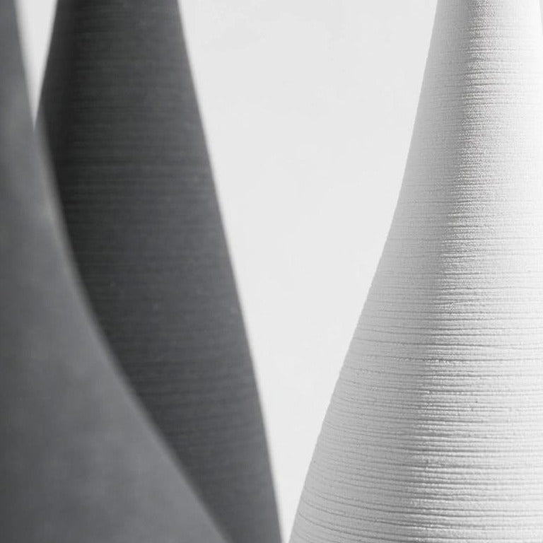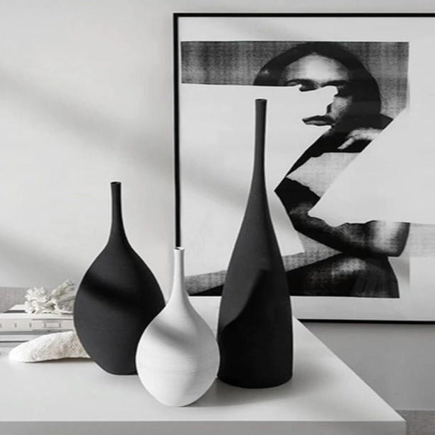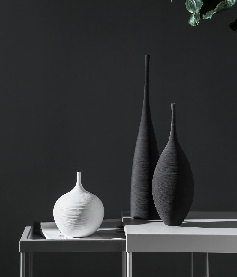 Embrace the sleek beauty of these bold vases. Each vase has its own unique shape and size that complements each other when grouped together. The slender design gives each vase a look of modern elegance. The bold colors of black and white give these vases a modern and bold look in any space. The beautiful ceramic texture gives these vases depth and gives any space an art gallery feel.