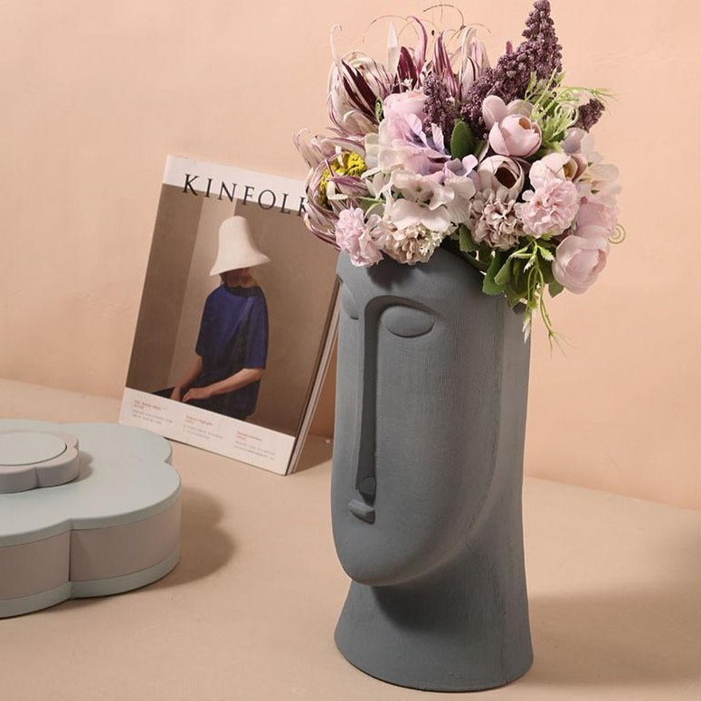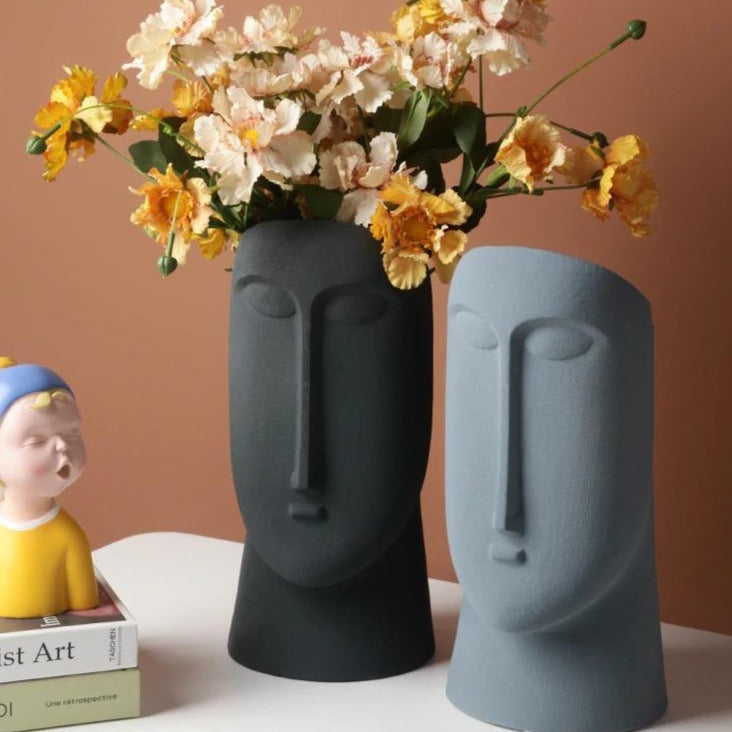 Artistic style meets function with these abstract vases that enbrace the beauty of the face. The vases embrace simplicity with a stylish flair. Each vase has a distinct look and makes a dramatic statement when grouped togther.