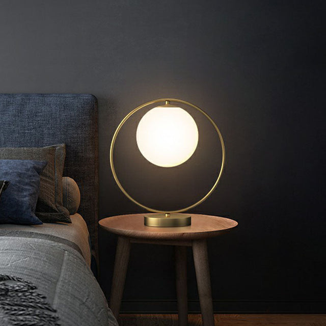 Ball Shaped Bedside Night Lamp White Glass Single Minimalistic Table Light with Ring Decor in Gold