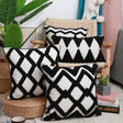 These black and white pillow covers make a bold statement in any space, The hand tufted fringe is the perfect accent to the boldness of the black against the white cotton background. These pillow covers have texture that create a depth to the design. Add the bold combination of bold and white and these pillows will become the focal point of any room.