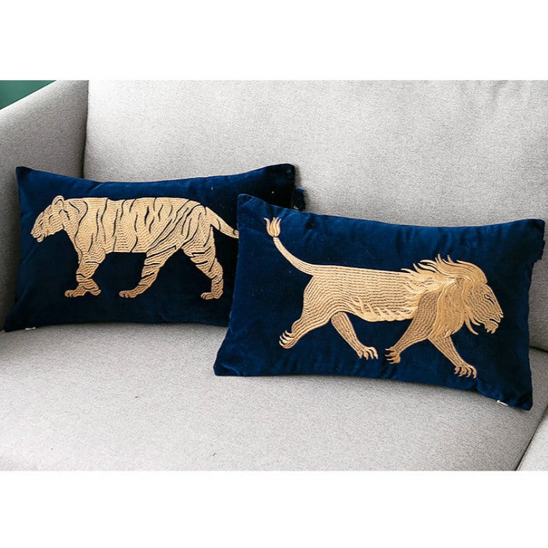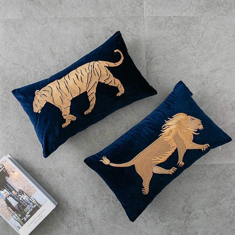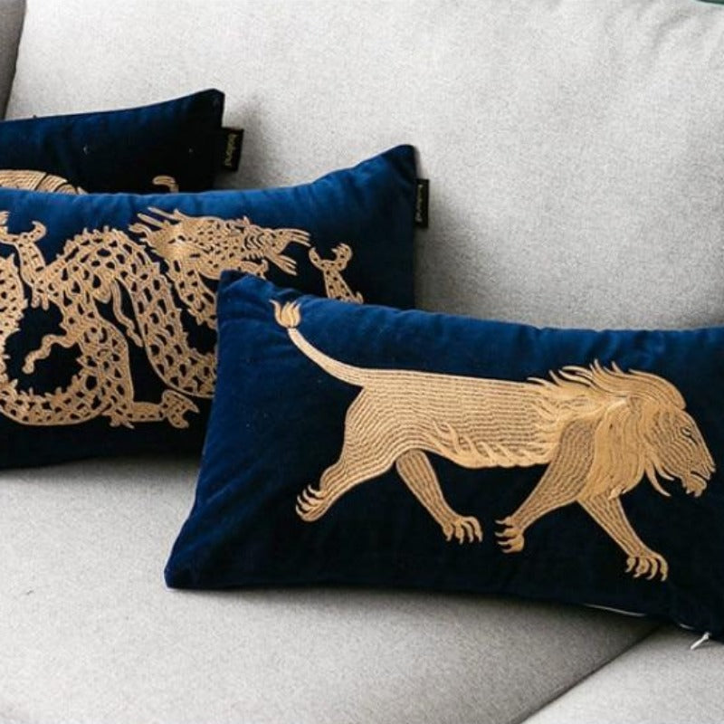 The royal velvet backdrop of our Fabulous Beasts covers bring rich sophistication to any seating with their bold and charming golden embroidered illustrations. Touchably plush, meticulously stitched and finished with tailored seams, these pieces go with most any décor, and will instantly add fierce personality to any pillow collection. These beasties are an oh-so sleek find that introduce a mystical-yet-whimsical flair to your home that radiates magical animal magnetism.