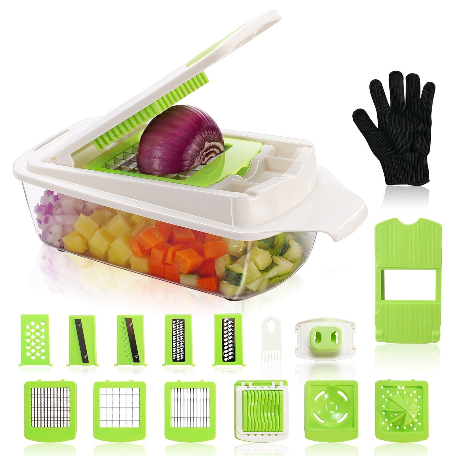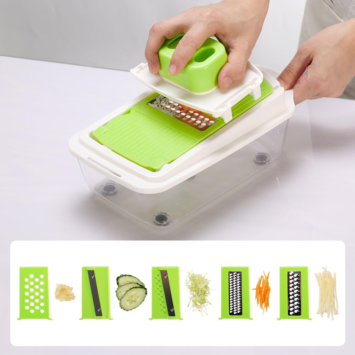 2.Best Operate Design: Container with non-slip foot increase the stability; The safety food holder prevents food from slipping while cutting small vegetables and fruits, also makes it more clean and safe; the extra protective gloves are equipped to completely protect the safety of your hands.