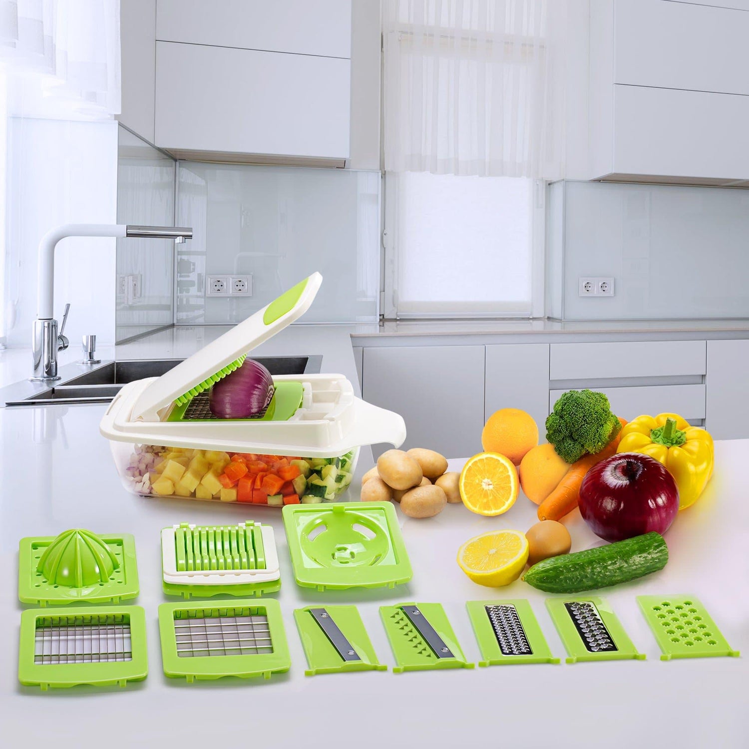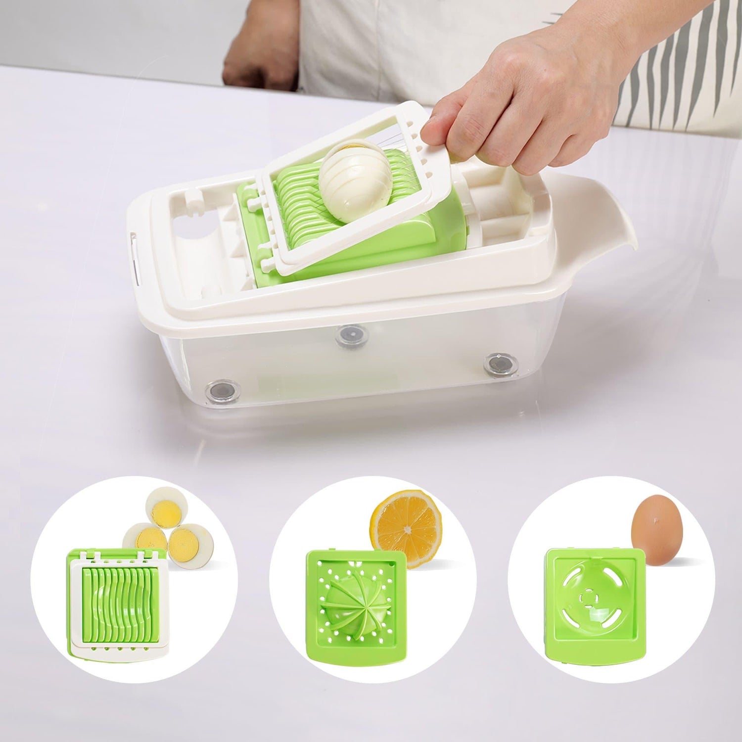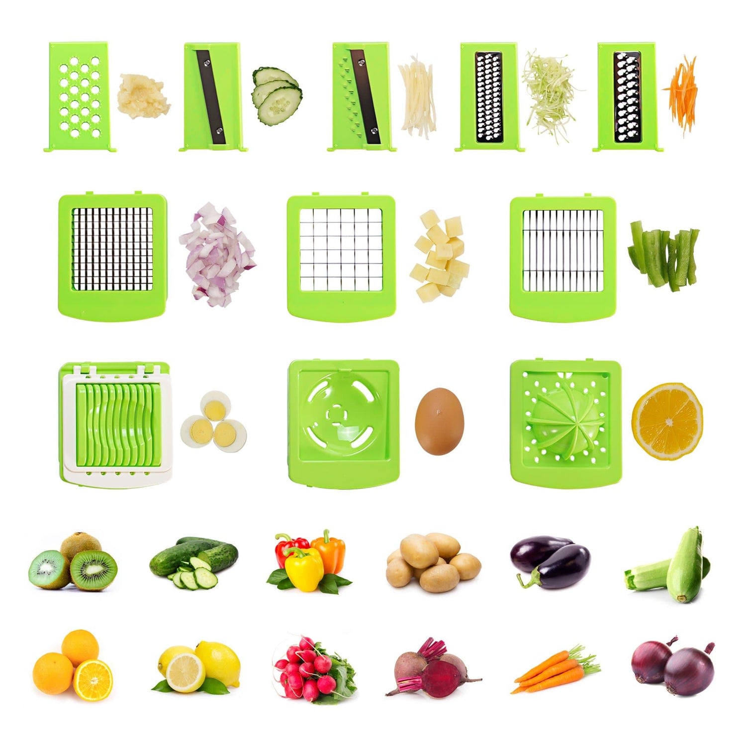 1.Multifunction Kitchen Gadget: 8 Diverse Blades - three different sized chopper blades and 5 interchangeable blades for slicing, julienne, grating & shredding; Juicer, egg separator and egg slicer - juice your fresh lemons, separate your yolks from your egg whites and slice your hard-boiled eggs easily. Chop, Dice, Slice or Grate with the multifunction Kitchen Gadget set can greatly shorten the time to prepare food.