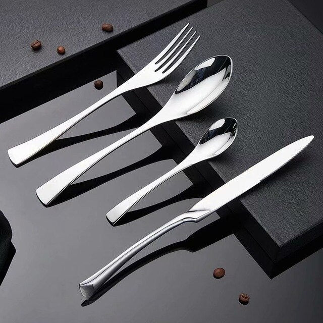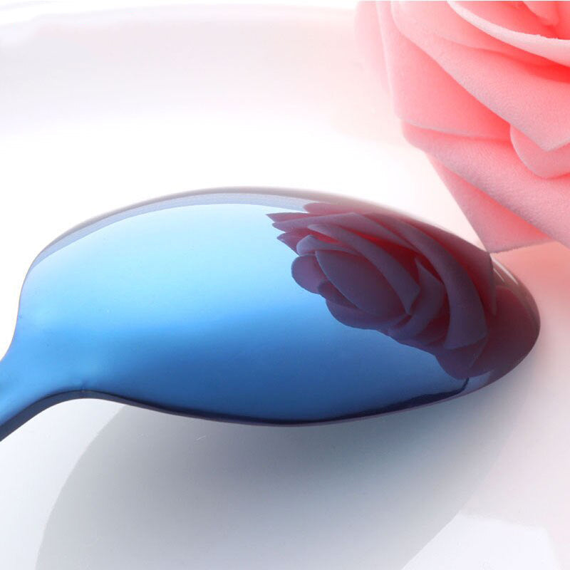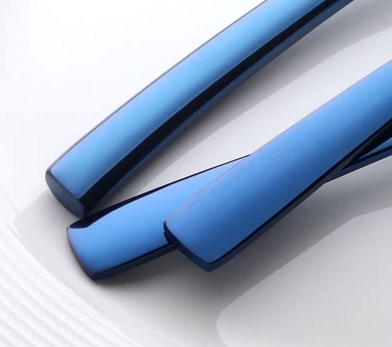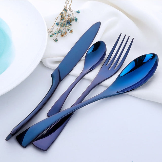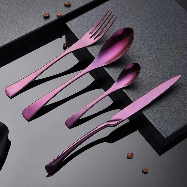 Make your table the center of attention with this sleek stainless steel cutlery in 6 colors, Deep Black, Majestic Purple, Brilliant Blue, Lustrous Silver, Raibow and Gilded Gold. The sleek design will add modern elegance to any table. It comes in individual sets of 4 pieces that serves one but you can order multiple sets to complete your dining needs. Dine in sophistication while enjoying the deep colors of this sophisticated cutlery.