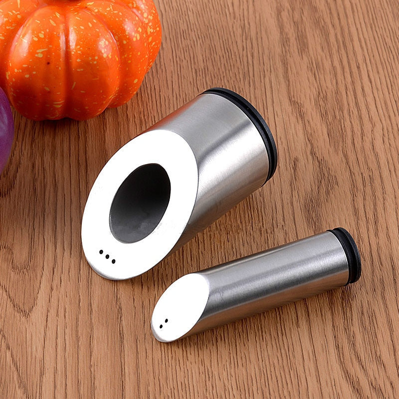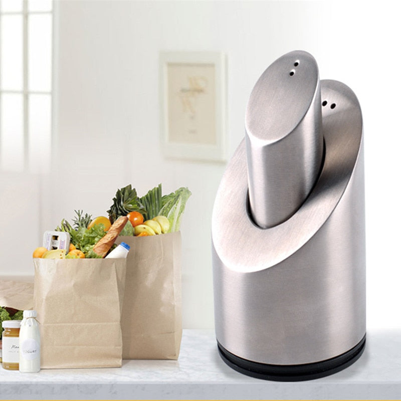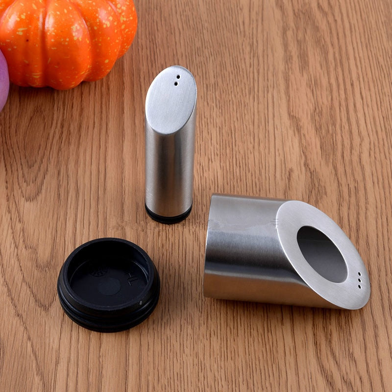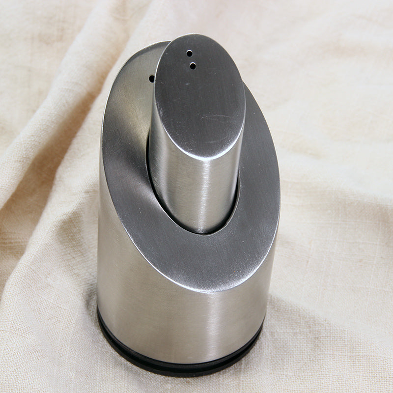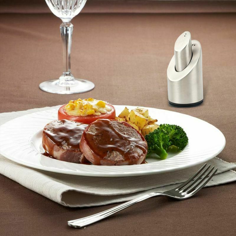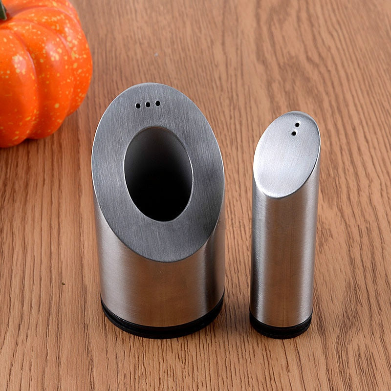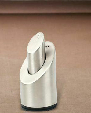 Salt and pepper shakers enter the modern age. These stainless steel shakers are two shakers in one. The larger outer shaker is for pepper and the smaller core is for salt. The shakers add a modern look to any table. No more boring salt and pepper shakers with this set.