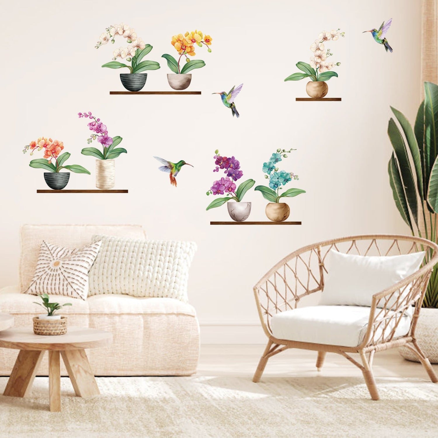 1. This decal included colorful Orchids and three hummingbirds, which are beautifully designed, decorate your bedroom with stylish and warm cartoon effects