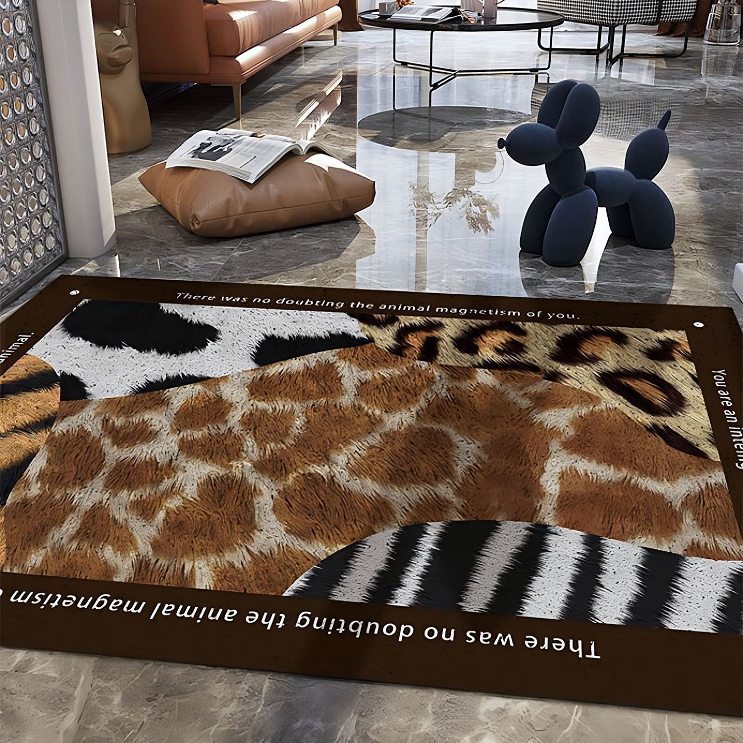 Material: This rug is an imitation animal skin rug, which is made of polyester fibers. It includes leopard, tiger, bear deer, zebra and panda prints.
