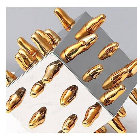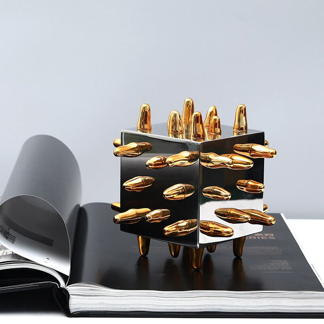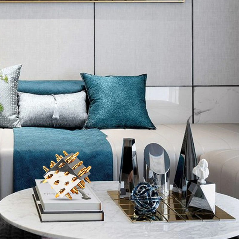 Embrace the look of modern art with this stainless steel cube. The spiked cube is the perfect tabletop decoration to give any space the look of luxurious modern art. It comes in gold or silver and two different sizes. Group them together to create a real conversation piece in any space.