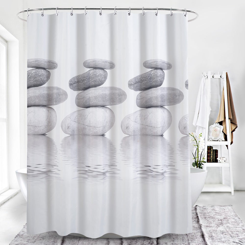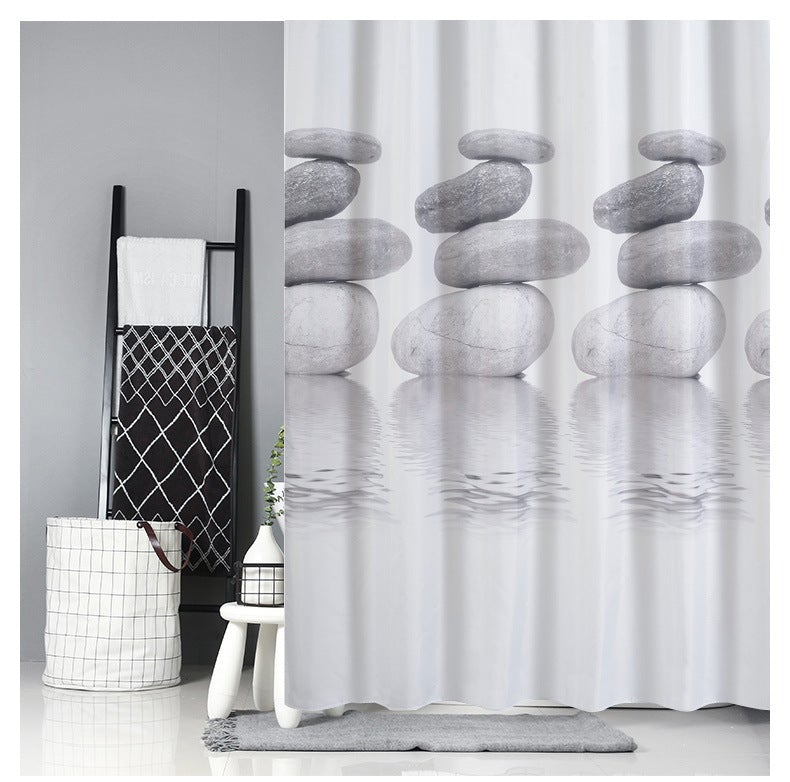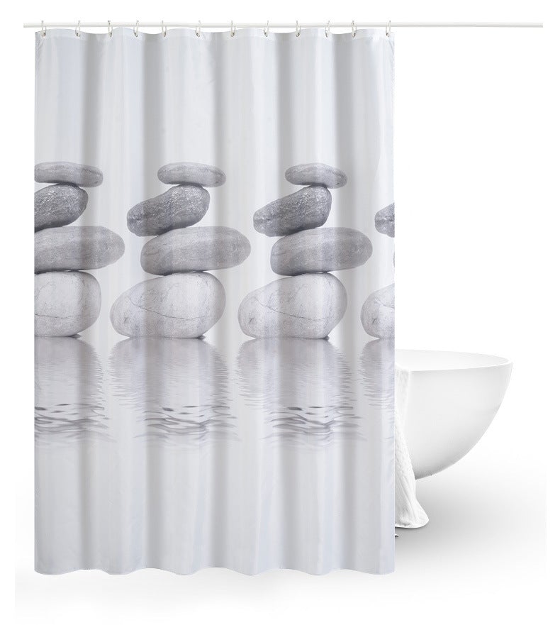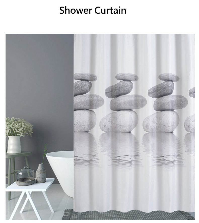 - Water-repellent printed fabric shower curtain with metal grommets and white plastic hooks