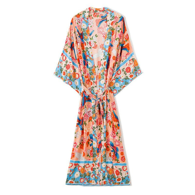 Cotton Kimono Boho Vintage Fly Bird Print Sashes Women Bohemian V Neck Batwing Sleeves happy short robe Kimono Jacket,gift for her - Size S / Pink is backordered and will ship as soon as it is back in stock.