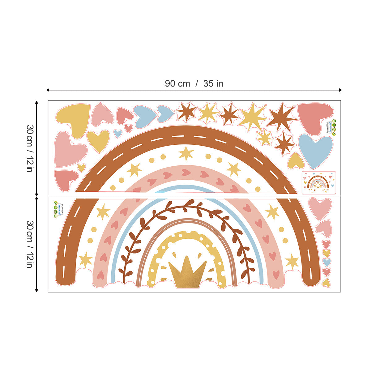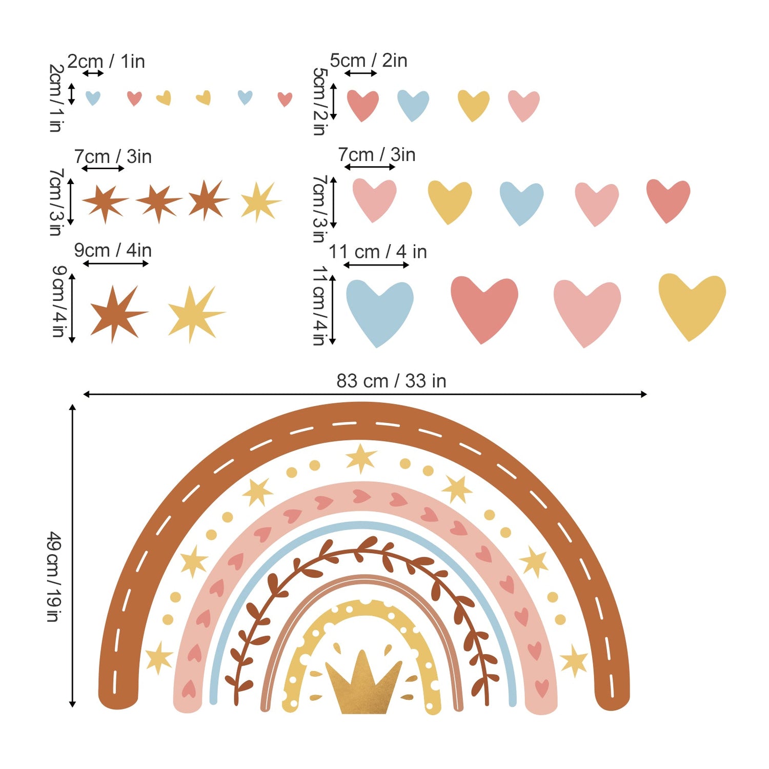 This wall sticker includes a beautiful big rainbow, colorful hearts and stars, are beautifully designed, decorate your room with a strong bohemian style, sweet colors and warm effects.