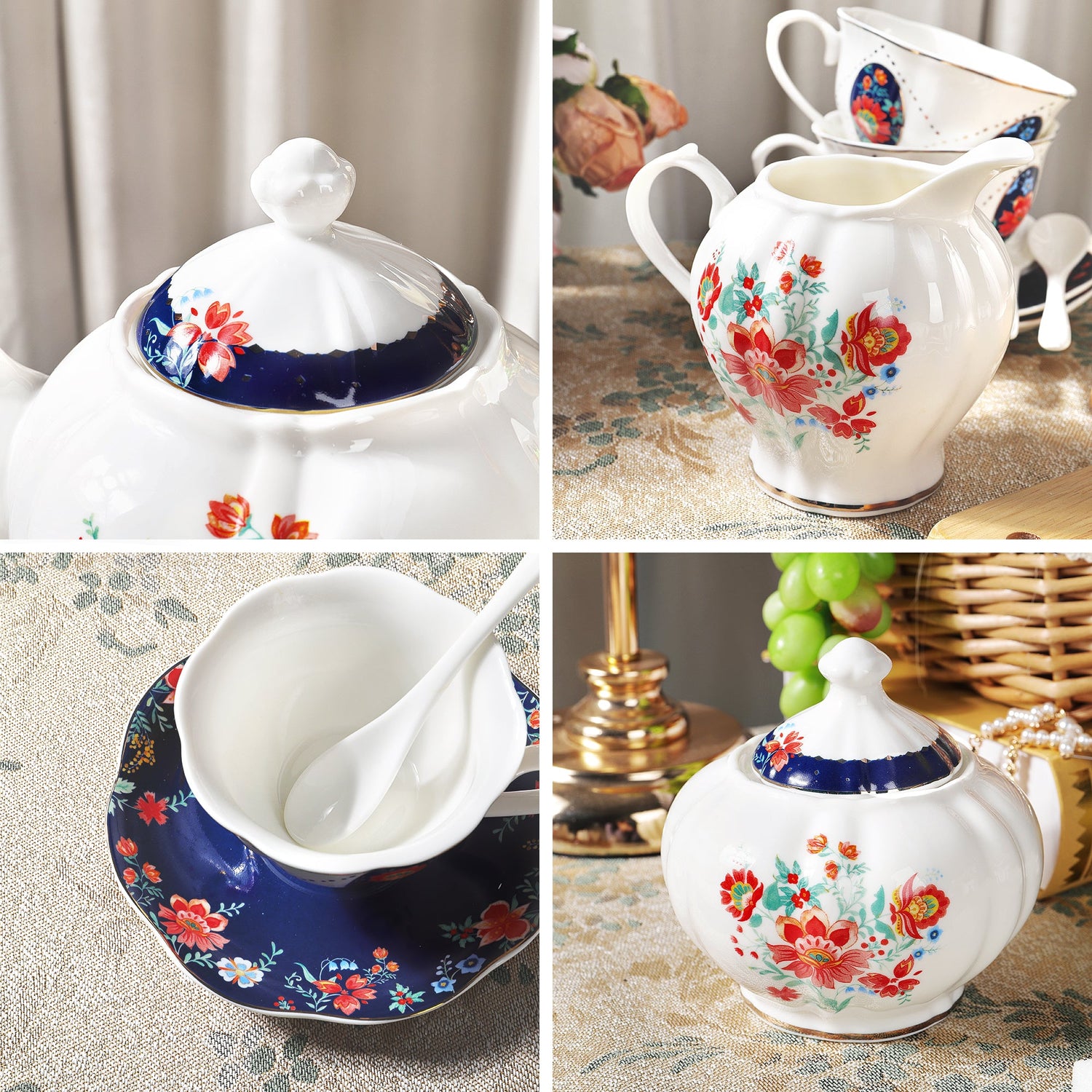PACKAGE: 1 Teapot, 1 Sugar Bowl, 1 Milk Jug, 6 Tea Cups, 6 Saucers, 6 Spoons. With the colorful flowers, this Chinese teacup set is a unique d?cor on your table at any tea party, creating an upscale and inviting atmosphere.