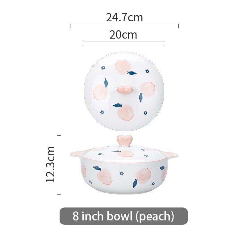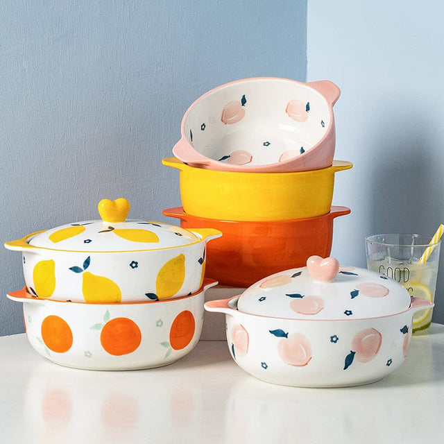 Enjoy hot, steamy sips of your favorite soup from this ceramic crock, topped with a fruit motif and glazed finish in vibrant hues we love.