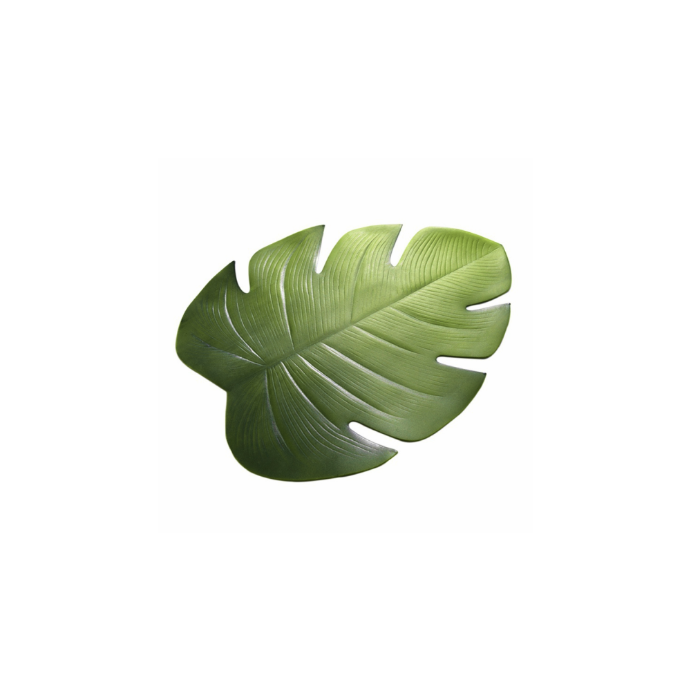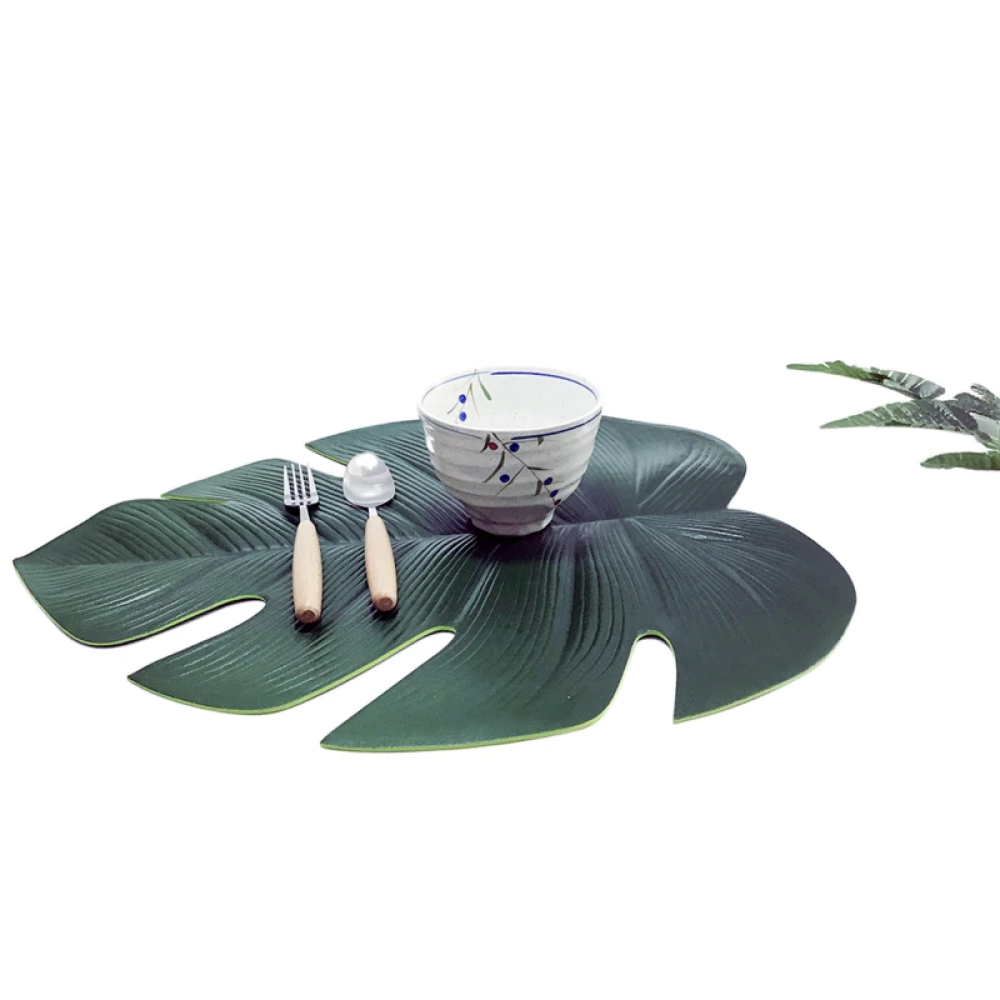 Bring the feel of the tropics with this banana leaf placemat and coaster set. The set are made of PVC material and are durable, stain resistant and waterproof. These are perfect for outdoor and indoor use. Add a tropical feel to any of your gatherings with this lush green tropical set. Complete the look with the Kalani Table Runner and let your space become a tropical paradise.