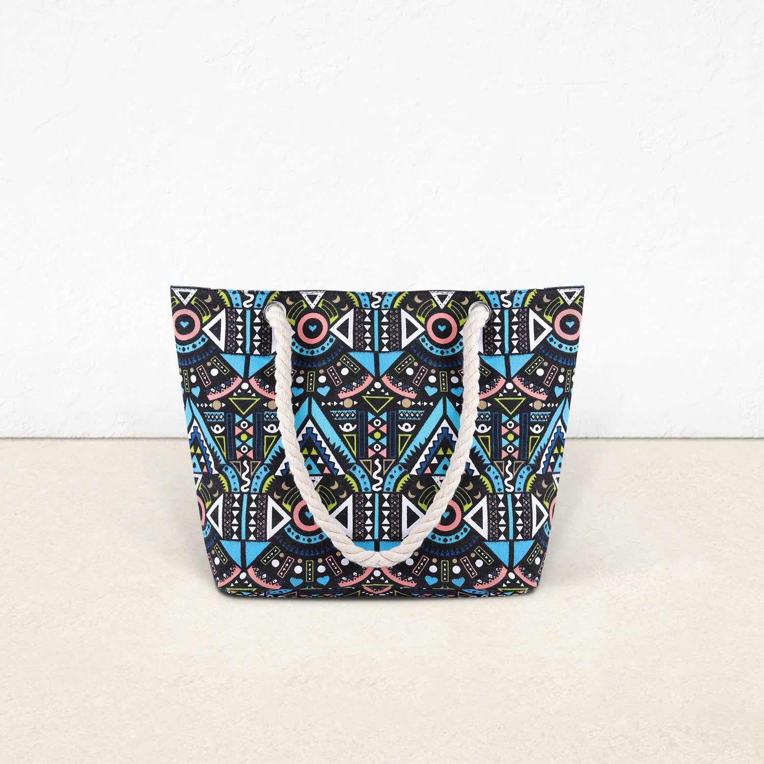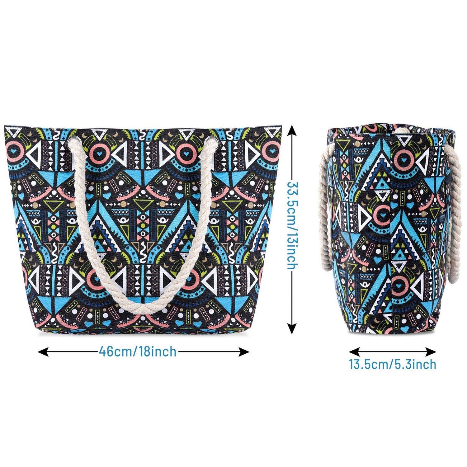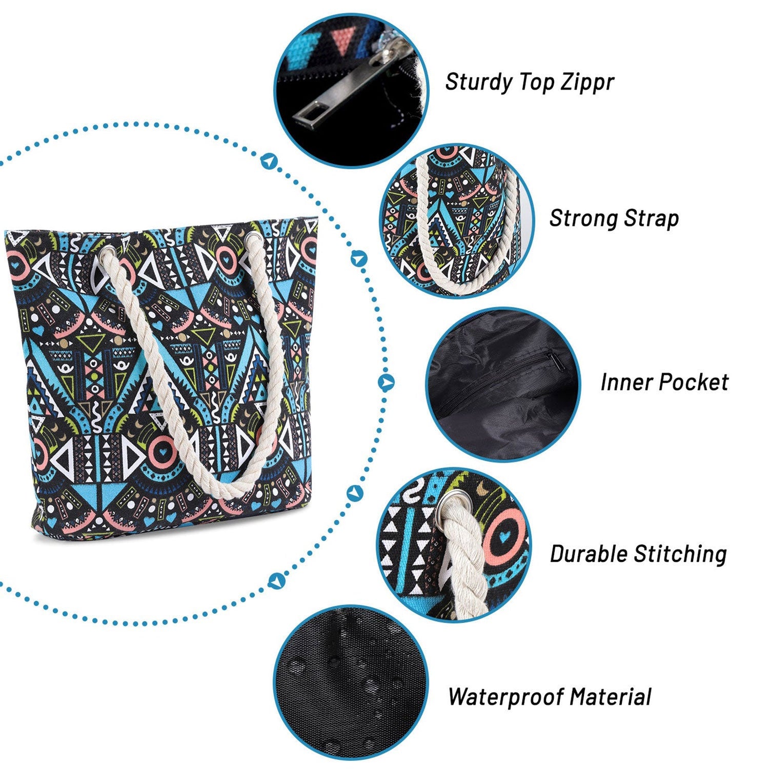 Canvas Tote Bags Geometric Pattern Beach Bags Grocery Shopping Bags Large Pool Bag, Top Zipper Closure