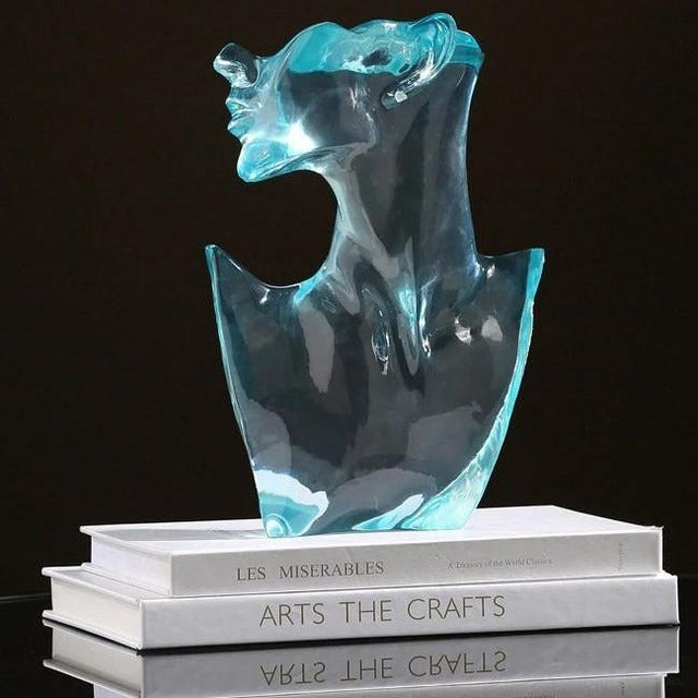 The translucent abstract bust of a woman emerges from deep in thought. The bust seems to emerge from its own thoughts as it glances to the side ever so subtly. The bust is made from art gallery quality resin and its crystalline properties resemble deeply sculpted glass. This work confronts the viewer with the beauty and drama of the sculpture's almost lifelike presence.
